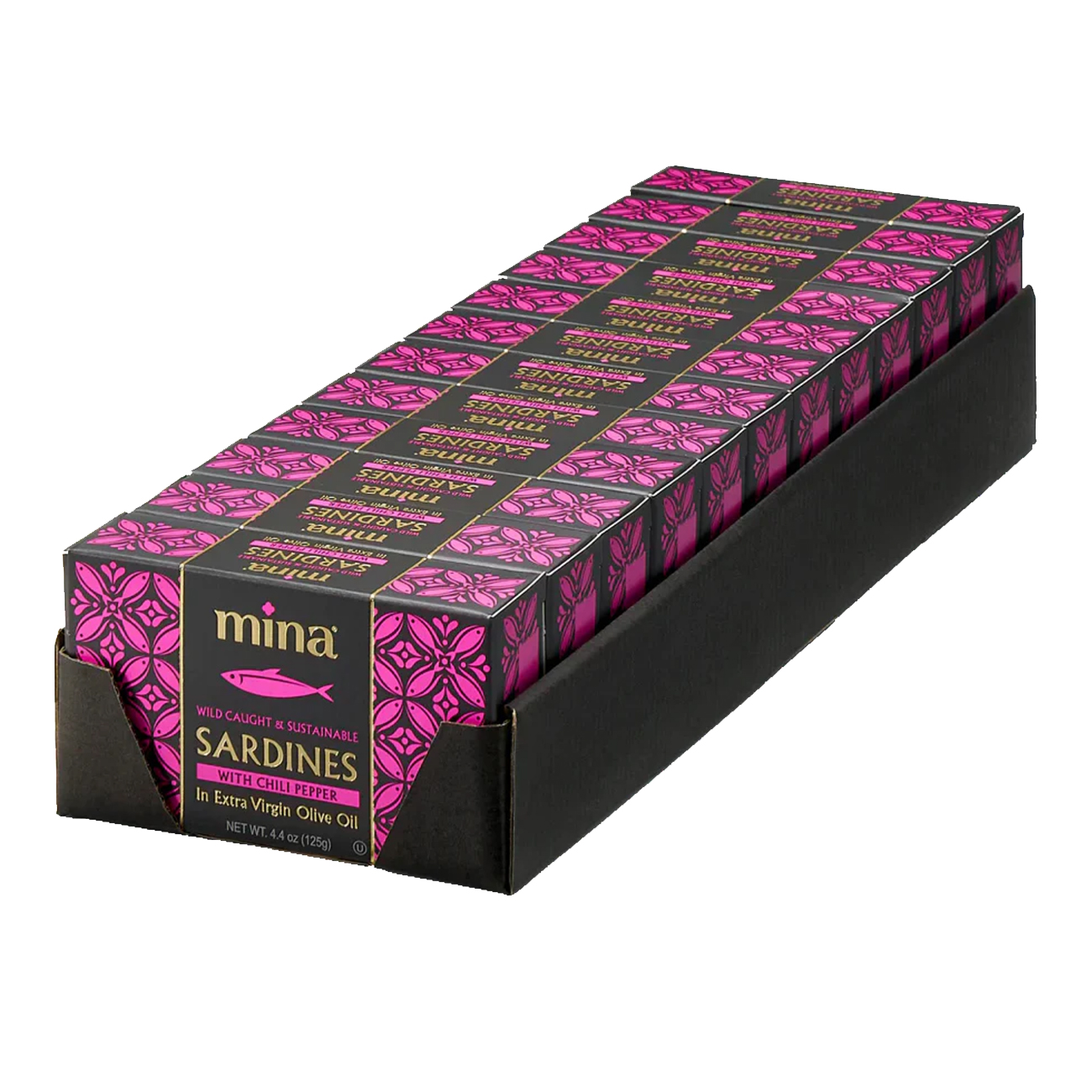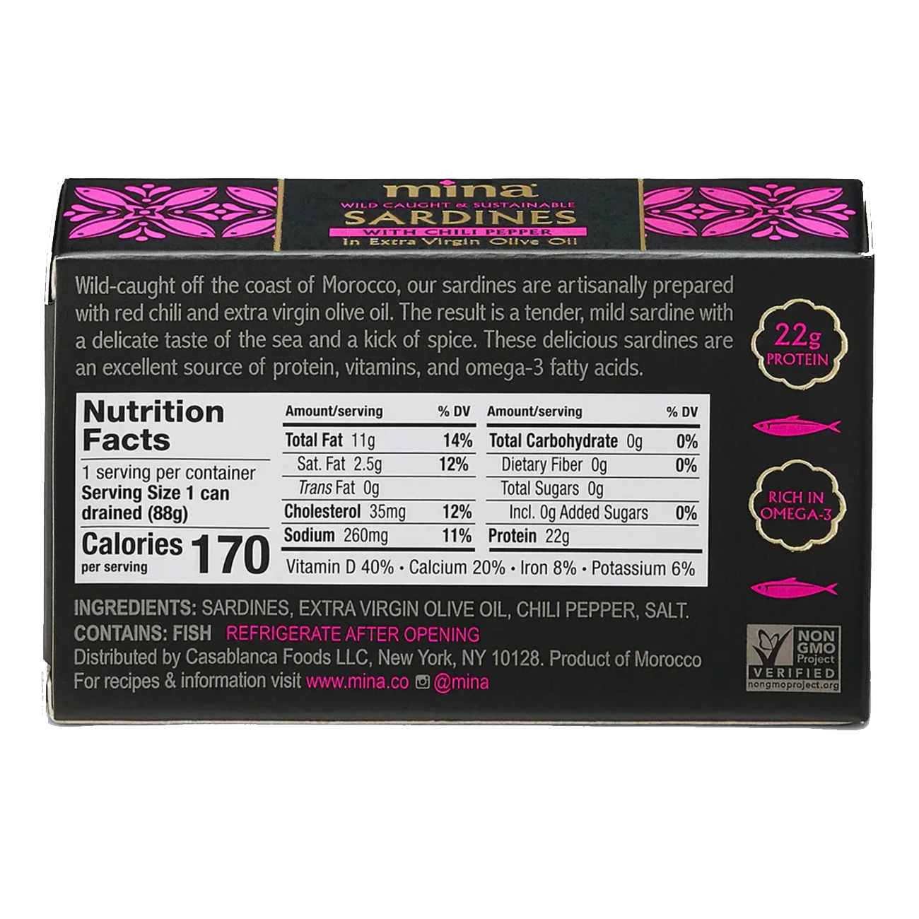 Wild-caught off the coast of Morocco, our sardines are artisanally-prepared with red chili and extra virgin olive oil. The result is a tender, mild sardine with a delicate taste of the sea and a kick of spice. These delicious sardines are an excellent source of protein, vitamins, and omega-3 fatty acids.